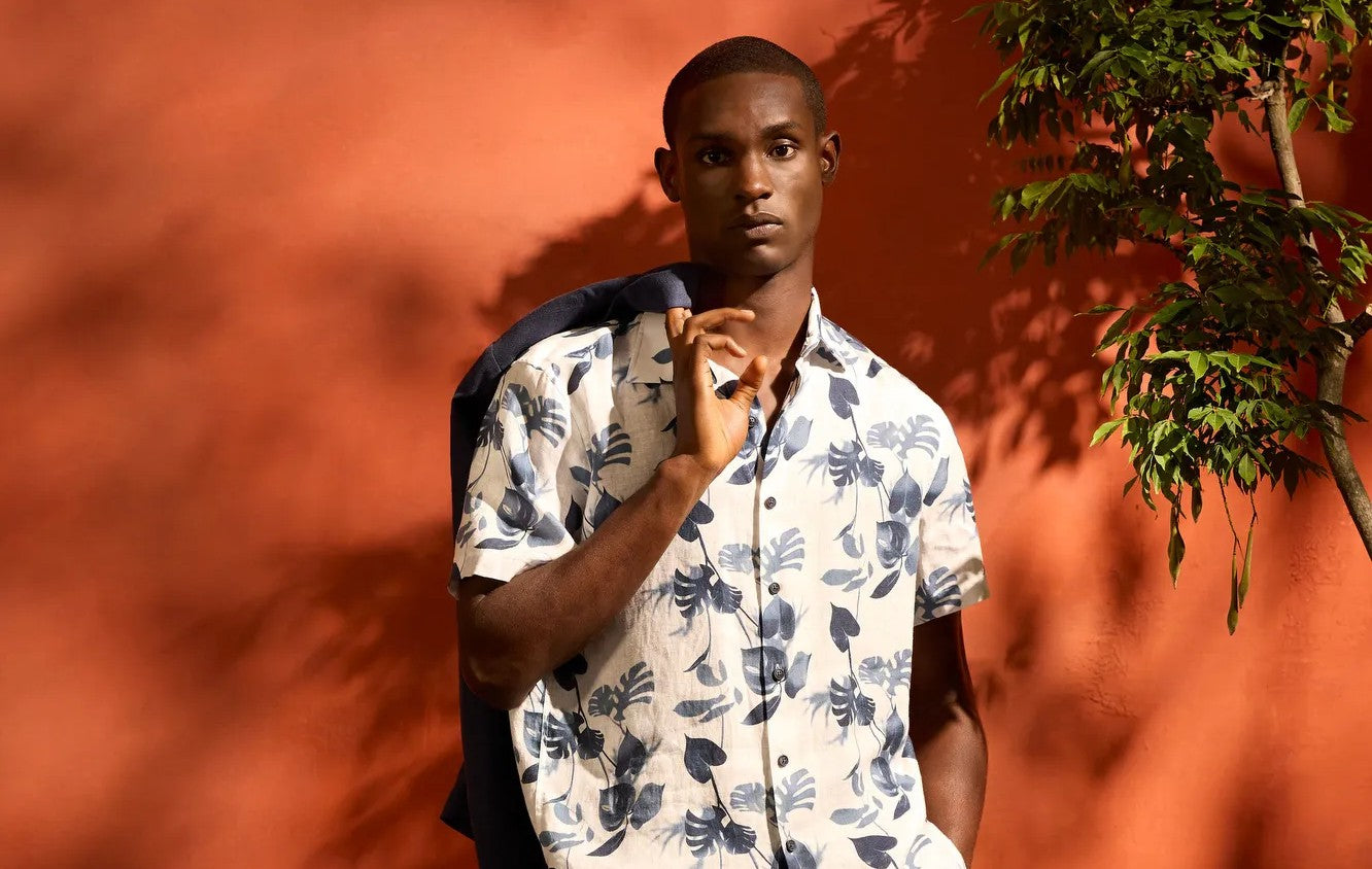 Witness the magic of this airy linen blazer in a soft beige shade! It dances between classy and carefree with ease. The defined shoulders and neat lapels pay homage to old-school tailoring, while the earthy fabric whispers of a tropical retreat. Below, a bold floral shirt adorned with a palm leaf motif delivers an unforeseen pop of color. The serene blues and greens within the pattern conjure images of ocean winds and luxurious landscapes, complementing the neutral shade of the blazer seamlessly.