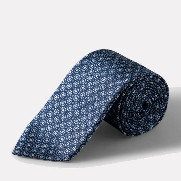 100% Italian Silk, Woven Jacquard Floral Medallion Tie / Marine