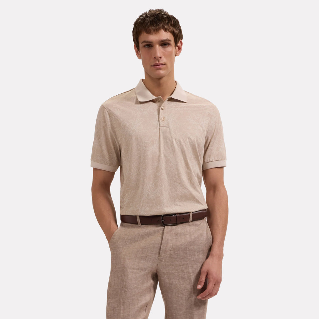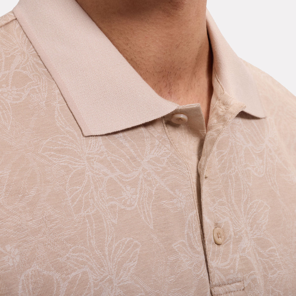 This three-button polo is crafted from a lightweight, moisture-wicking performance fabric for all-day comfort and ease. Featuring an intricate allover floral print, it's designed with a bird's-eye rib collar and cuffs accented by contrast tipping. Finished with mother-of-pearl buttons and side vents for enhanced mobility, it's a versatile choice for resort wear, casual occasions, or a day on the golf course.