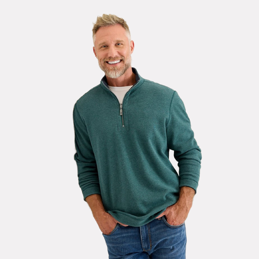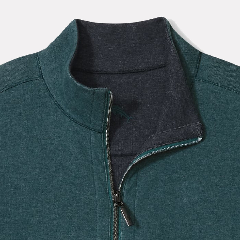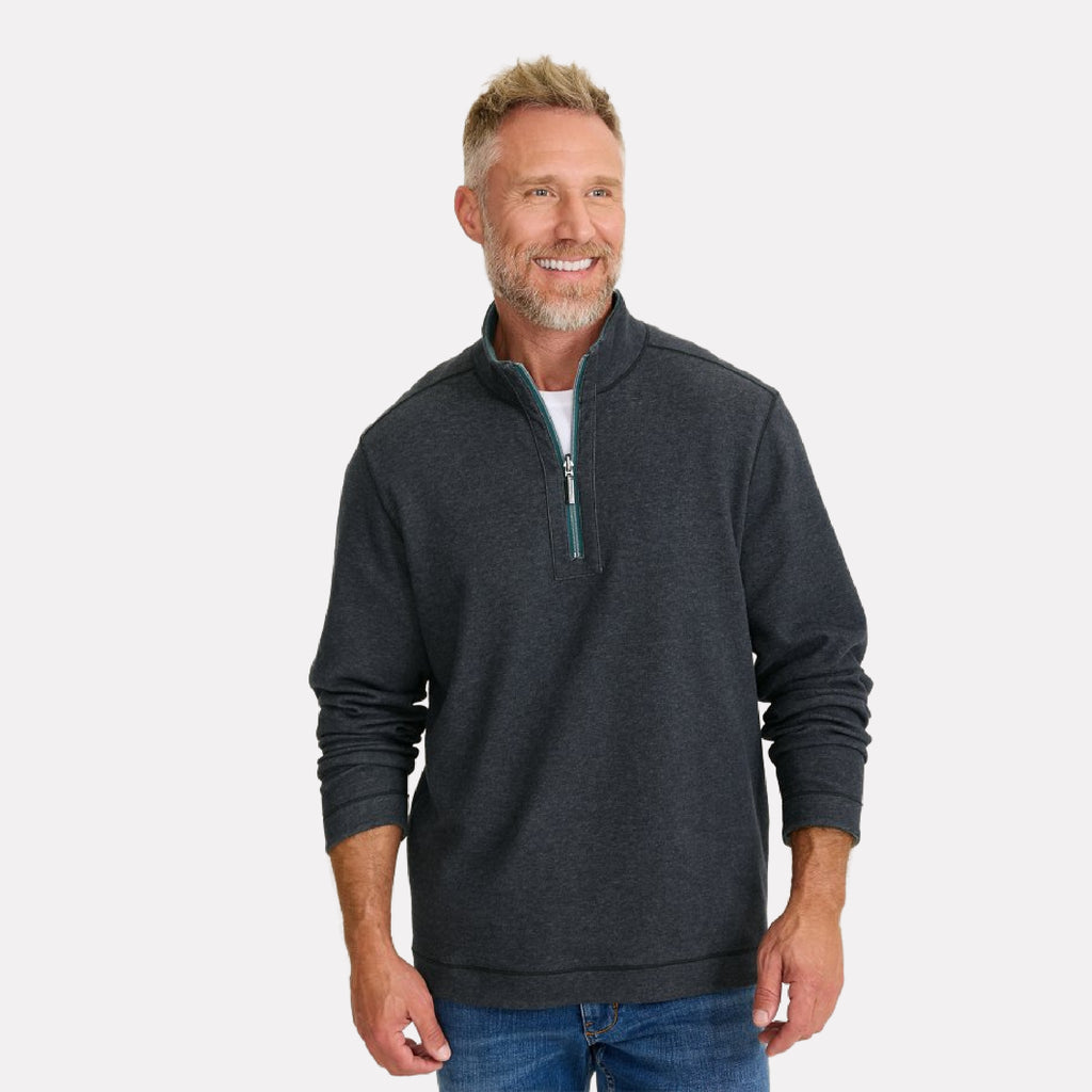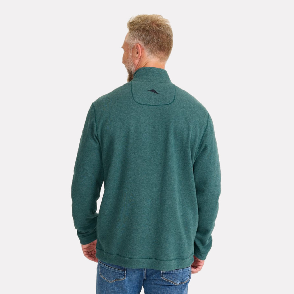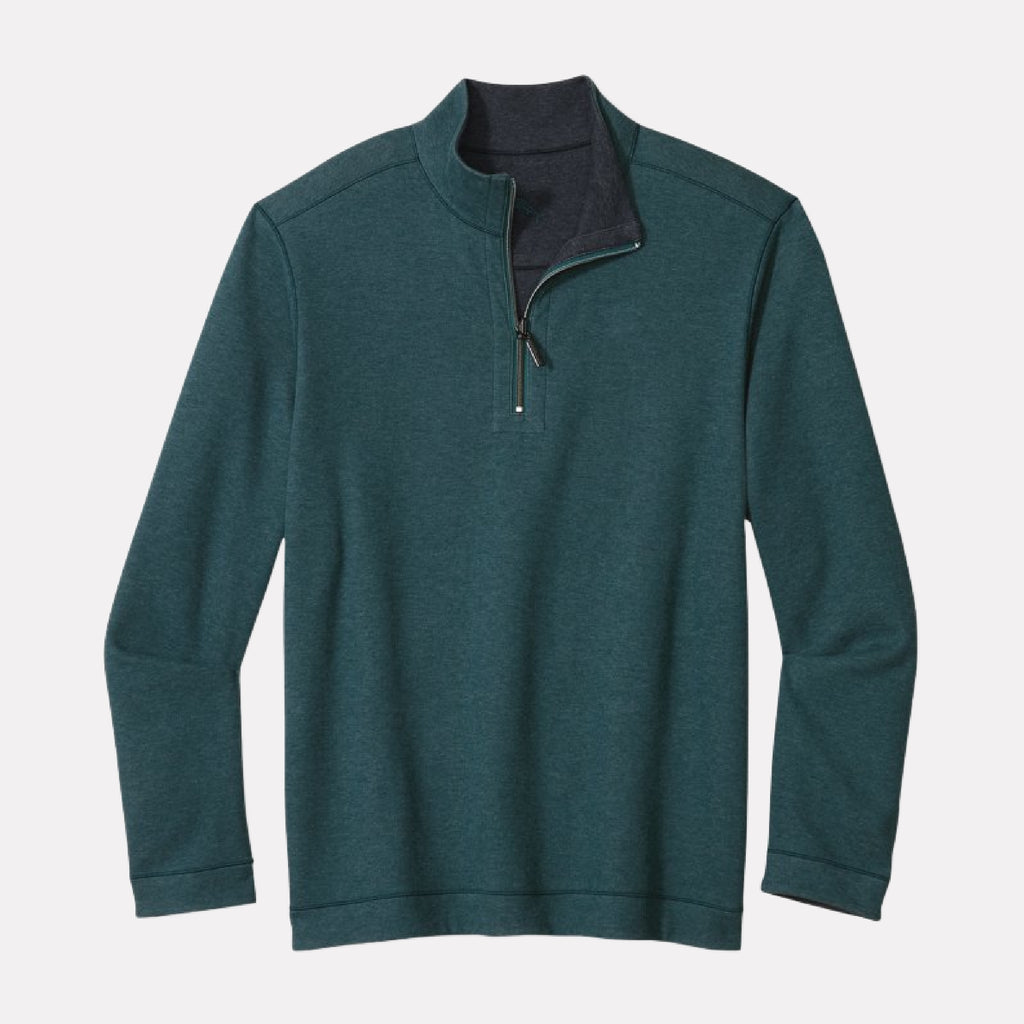 Switch up your style with the Tommy Bahama Flipview Half Zip Reversible Cotton Pullover. One side features a sophisticated heathered design with elevated trim, while the other boasts a relaxed jacquard pattern. Perfect for any occasion, this versatile pullover is a must-have for everyday living. No need to choose between polished and casual - you can have both!