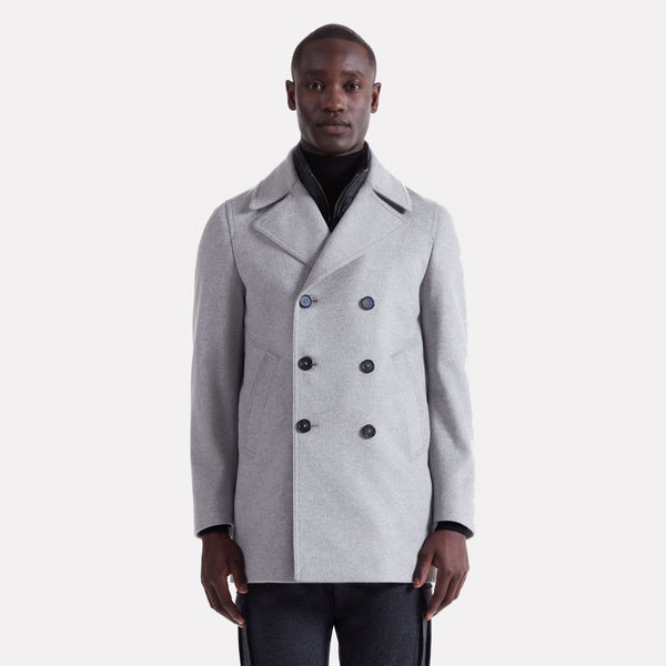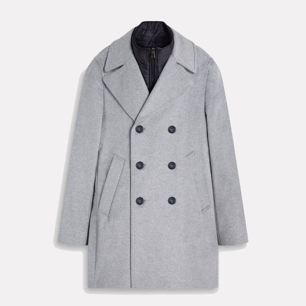 Light gray double-breasted pea-coat sets the tone. Black quilted vest adds modern edge. Burgundy sweater injects personality.