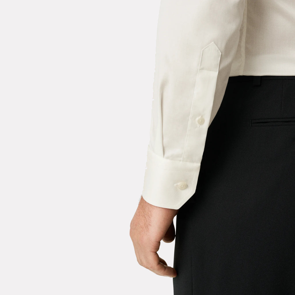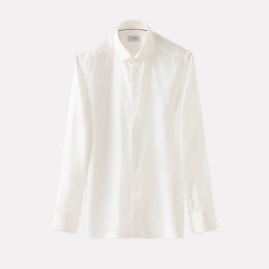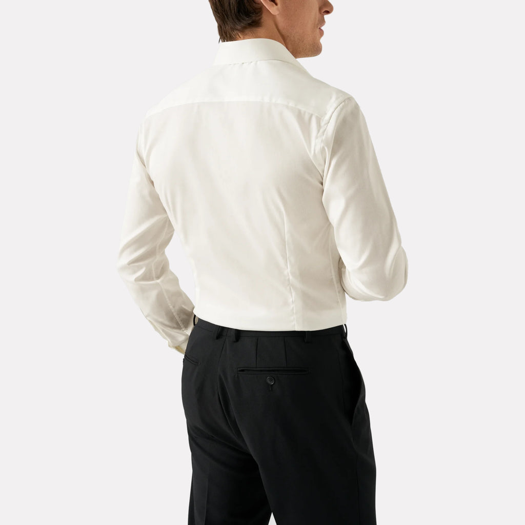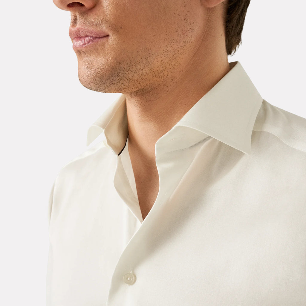 Look sharp and stylish with our Slim Fit Semi Solid Signature Twill Shirt in Off White. Made from 100% organic cotton, this wrinkle-free fabric boasts an outstanding crease-resistant performance. Say goodbye to creases and hello to effortless style.