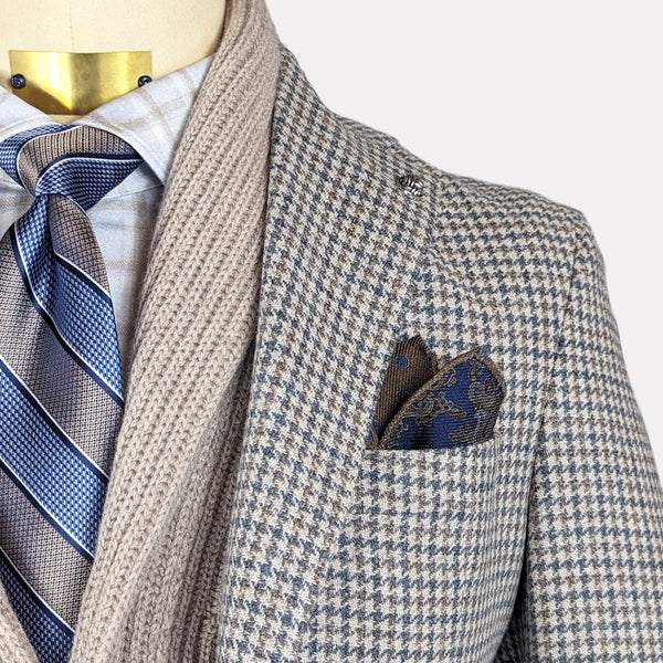 This look embraces a sartorial layering of soft elegance. Draped in a cozy Cashmere and Wool chunky knit shawl cardigan, exuding comfort and opulence effortlessly. This casual yet refined foundation is elevated to formal perfection with the addition of a gracefully tailored, soft constructed houndstooth coat, a super soft milled window pane check shirt and suede derby shoes. Each piece is a palette of balanced hues with timeless charm.